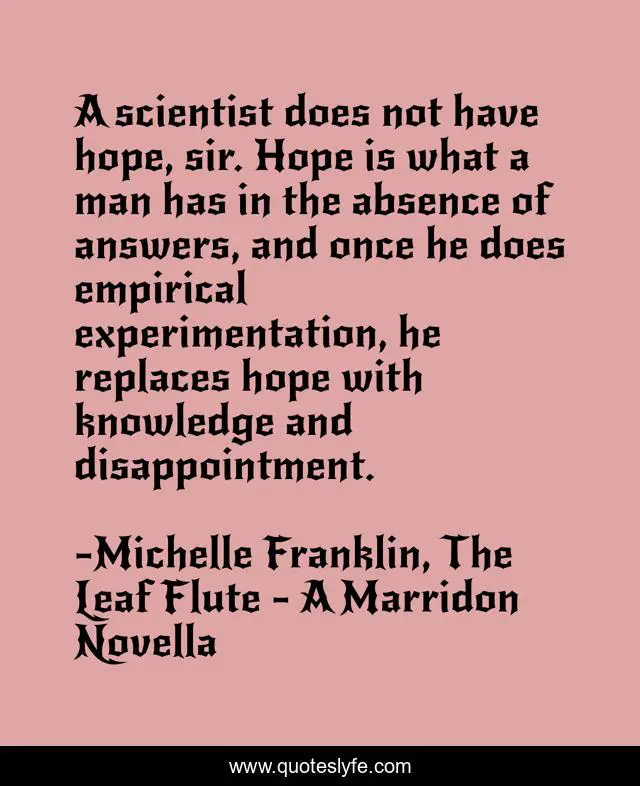 This page presents the quote "A scientist does not have hope, sir. Hope is what a man has in the absence of answers, and once he does empirical experimentation, he replaces hope with knowledge and disappointment.". Author of this quote is Michelle Franklin, The Leaf Flute - A Marridon Novella. This quote is about humorous, science, reason, hope,.