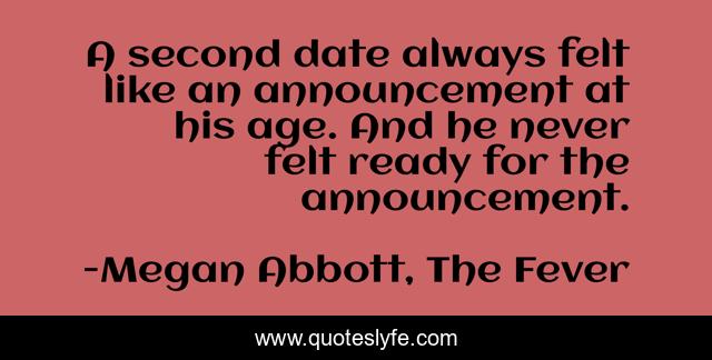 This page presents the quote "A second date always felt like an announcement at his age. And he never felt ready for the announcement.". Author of this quote is Megan Abbott, The Fever. This quote is about relationships, dating,.