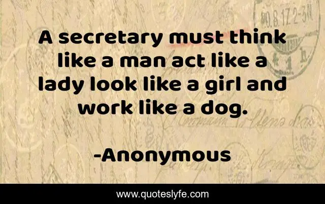 This page presents the quote "A secretary must think like a man act like a lady look like a girl and work like a dog.". Author of this quote is Anonymous. .