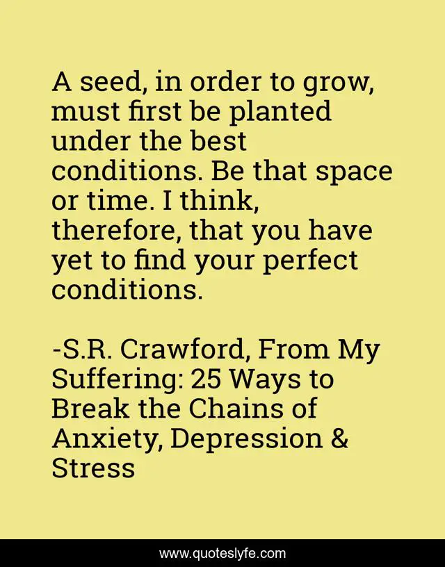 This page presents the quote "A seed, in order to grow, must first be planted under the best conditions. Be that space or time. I think, therefore, that you have yet to find your perfect conditions.". Author of this quote is S.R. Crawford, From My Suffering: 25 Ways to Break the Chains of Anxiety, Depression & Stress. This quote is about life, mental-health, growth, seed, inspiration,.