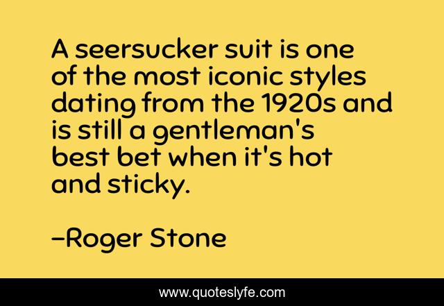 This page presents the quote "A seersucker suit is one of the most iconic styles dating from the 1920s and is still a gentleman's best bet when it's hot and sticky.". Author of this quote is Roger Stone. This quote is about hot, gentleman, best,.