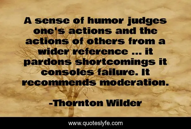This page presents the quote "A sense of humor judges one's actions and the actions of others from a wider reference ... it pardons shortcomings it consoles failure. It recommends moderation.". Author of this quote is Thornton Wilder. .