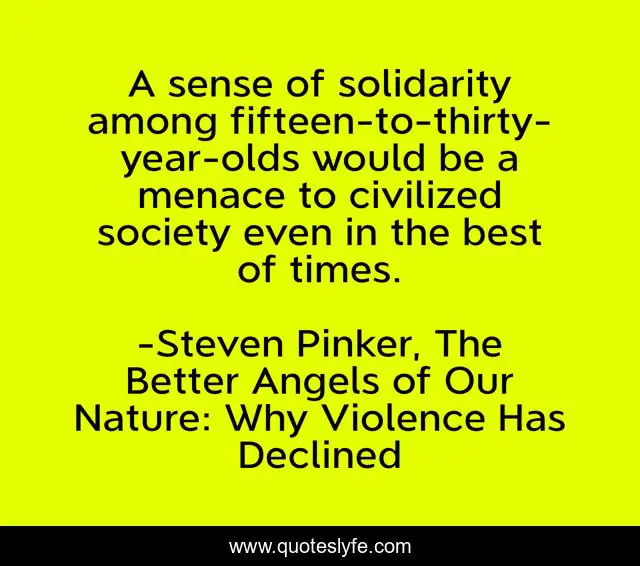 This page presents the quote "A sense of solidarity among fifteen-to-thirty-year-olds would be a menace to civilized society even in the best of times.". Author of this quote is Steven Pinker, The Better Angels of Our Nature: Why Violence Has Declined. This quote is about danger, violence, young, youth, society, solidarity,.