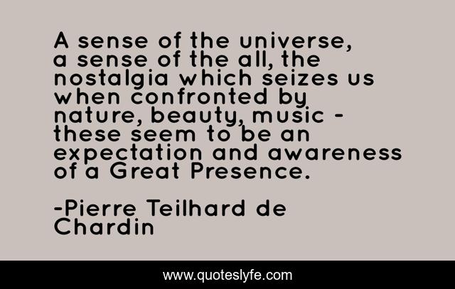 This page presents the quote "A sense of the universe, a sense of the all, the nostalgia which seizes us when confronted by nature, beauty, music - these seem to be an expectation and awareness of a Great Presence.". Author of this quote is Pierre Teilhard de Chardin. This quote is about great, music, beauty,.