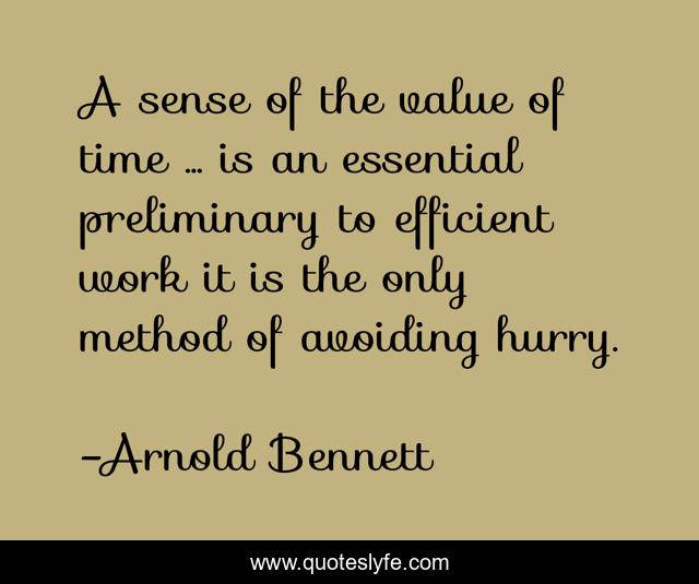 This page presents the quote "A sense of the value of time ... is an essential preliminary to efficient work it is the only method of avoiding hurry.". Author of this quote is Arnold Bennett. This quote is about day, one,.