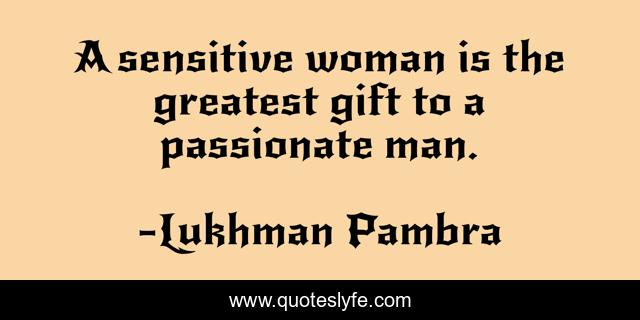 This page presents the quote "A sensitive woman is the greatest gift to a passionate man.". Author of this quote is Lukhman Pambra. This quote is about passionate-lover, couples, love, relationship, gift, romance, marriage, sensitive-people, affection,.