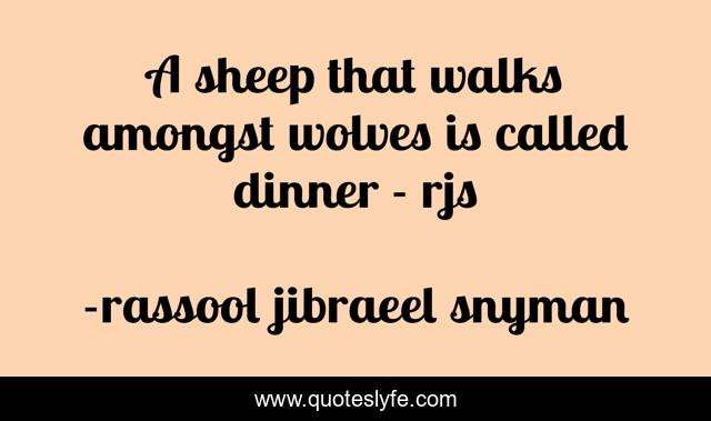 This page presents the quote "A sheep that walks amongst wolves is called dinner - rjs". Author of this quote is rassool jibraeel snyman. This quote is about motivation, philosophy, positive, motivational, confidence, philosophical, optimistic, inspirational, politics,.