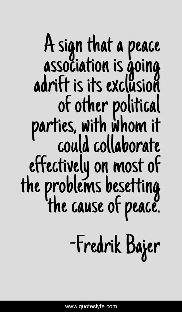 This page presents the quote "A sign that a peace association is going adrift is its exclusion of other political parties, with whom it could collaborate effectively on most of the problems besetting the cause of peace.". Author of this quote is Fredrik Bajer. This quote is about problems, political, sign,.