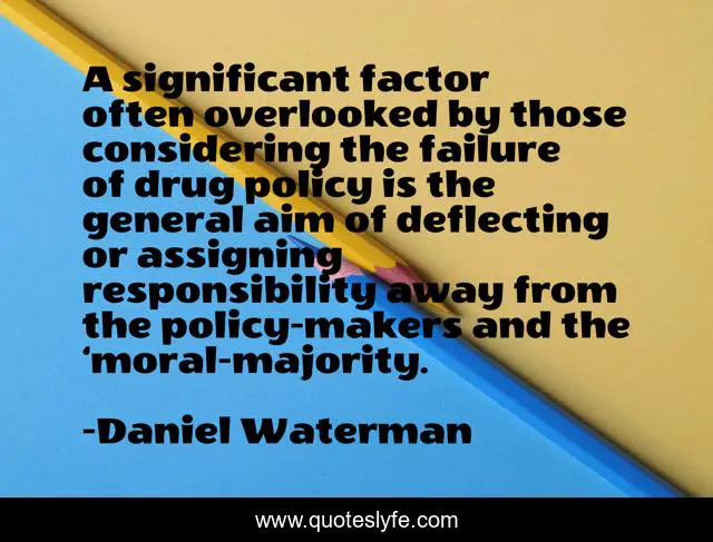 This page presents the quote "A significant factor often overlooked by those considering the failure of drug policy is the general aim of deflecting or assigning responsibility away from the policy-makers and the ‘moral-majority.". Author of this quote is Daniel Waterman. This quote is about policy, drug-policy, responsibility, moral-majority,.