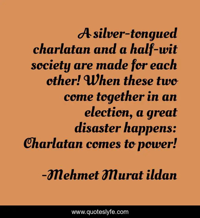 This page presents the quote "A silver-tongued charlatan and a half-wit society are made for each other! When these two come together in an election, a great disaster happens: Charlatan comes to power!". Author of this quote is Mehmet Murat ildan. This quote is about turkish-aphorisms, charlatan, half-wit, mehmet-murat-ildan, ildan-wise-sayings, turkish, ildan-wisdom, bad-politicians, turkish-sayings,.