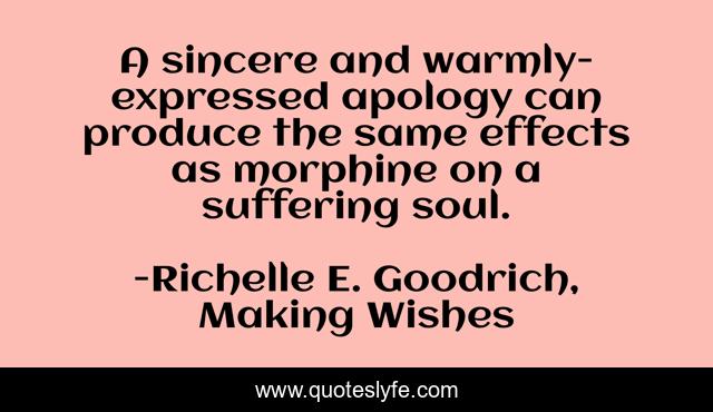 This page presents the quote "A sincere and warmly-expressed apology can produce the same effects as morphine on a suffering soul.". Author of this quote is Richelle E. Goodrich, Making Wishes. This quote is about morphine, apology, richelle-e-goodrich, suffering, richelle, i-m-sorry, apologize, richelle-goodrich, sorry,.