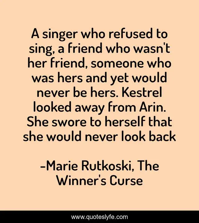 This page presents the quote "A singer who refused to sing, a friend who wasn't her friend, someone who was hers and yet would never be hers. Kestrel looked away from Arin. She swore to herself that she would never look back". Author of this quote is Marie Rutkoski, The Winner's Curse. This quote is about enemy, singer, curse, love, refusal, winner, never-look-back, swore, hers,.