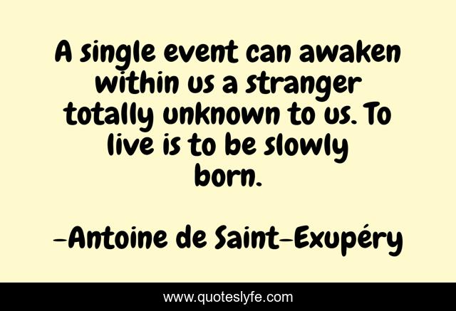 This page presents the quote "A single event can awaken within us a stranger totally unknown to us. To live is to be slowly born.". Author of this quote is Antoine de Saint-Exupéry. This quote is about living, awakening, unknown,.
