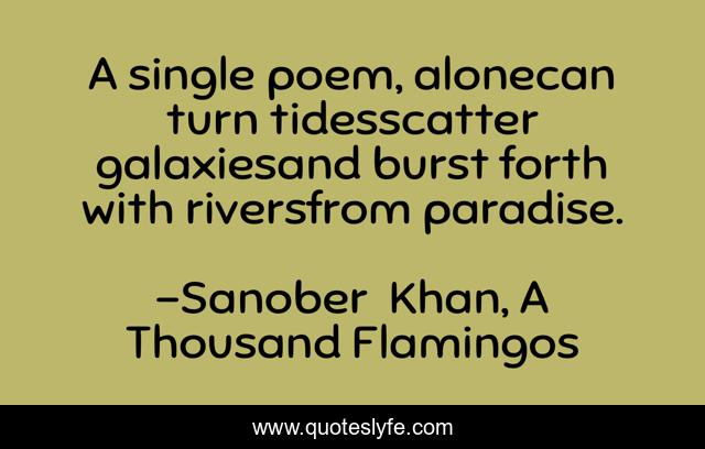 "Sanober Khan, A Thousand Flamingos Quotes." Quoteslyfe.com, 2025. Mon. 08 Dec. 2025. <https://www.quoteslyfe.com/quote/A-single-poem-alonecan-turn-tidesscatter-galaxiesand-66973>.