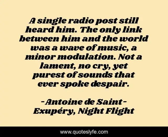 This page presents the quote "A single radio post still heard him. The only link between him and the world was a wave of music, a minor modulation. Not a lament, no cry, yet purest of sounds that ever spoke despair.". Author of this quote is Antoine de Saint-Exupéry, Night Flight. This quote is about connection, doom, flight,.