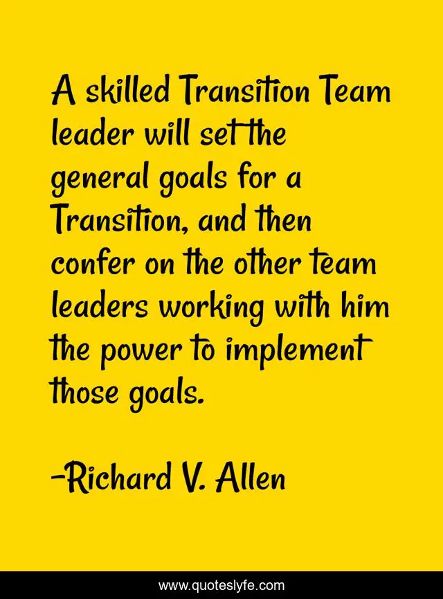 This page presents the quote "A skilled Transition Team leader will set the general goals for a Transition, and then confer on the other team leaders working with him the power to implement those goals.". Author of this quote is Richard V. Allen. This quote is about team, leader, goals,.