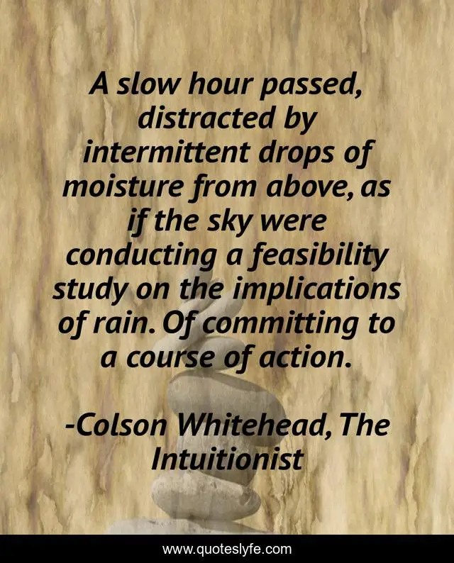 This page presents the quote "A slow hour passed, distracted by intermittent drops of moisture from above, as if the sky were conducting a feasibility study on the implications of rain. Of committing to a course of action.". Author of this quote is Colson Whitehead, The Intuitionist. .