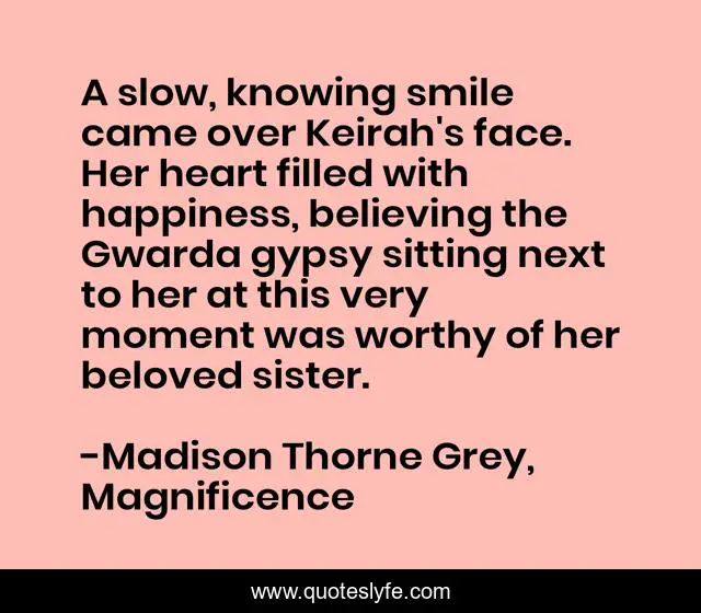 This page presents the quote "A slow, knowing smile came over Keirah's face. Her heart filled with happiness, believing the Gwarda gypsy sitting next to her at this very moment was worthy of her beloved sister.". Author of this quote is Madison Thorne Grey, Magnificence. This quote is about madison-thorne-grey, fantasy-romance, alpha-males, romance-novels, alpha-heroes, paranormal-romance,.