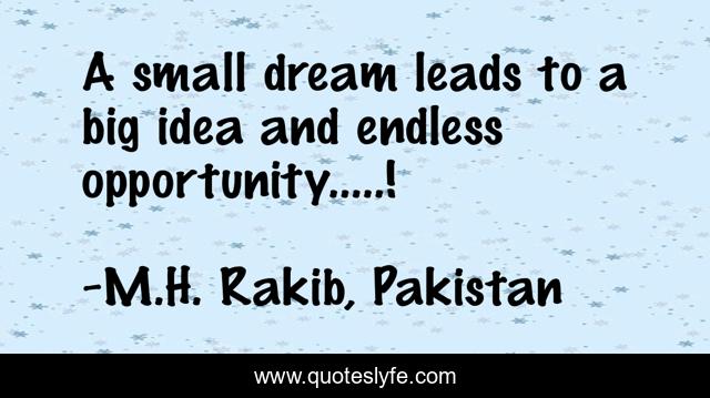 This page presents the quote "A small dream leads to a big idea and endless opportunity.....!". Author of this quote is M.H. Rakib, Pakistan. This quote is about pakistan, dreams-inspirational, dreams,.
