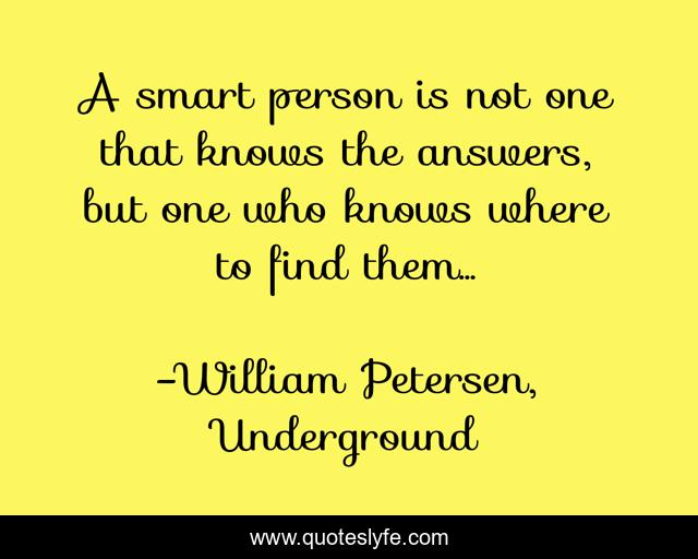 This page presents the quote "A smart person is not one that knows the answers, but one who knows where to find them...". Author of this quote is William Petersen, Underground. This quote is about fiction-writing, unicorns, adventure-stories, fiction, adventure, thrillers,.