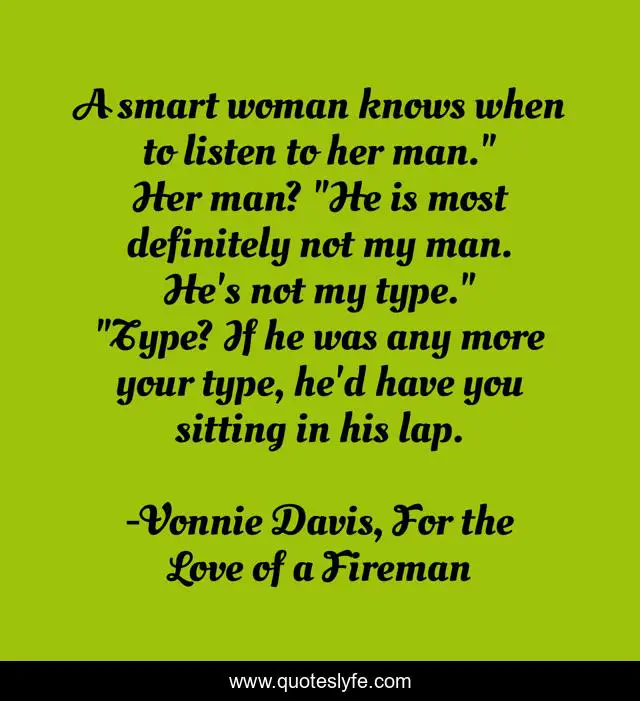 This page presents the quote "A smart woman knows when to listen to her man." Her man? "He is most definitely not my man. He's not my type." "Type? If he was any more your type, he'd have you sitting in his lap.". Author of this quote is Vonnie Davis, For the Love of a Fireman. This quote is about romance, firemen, suspense,.