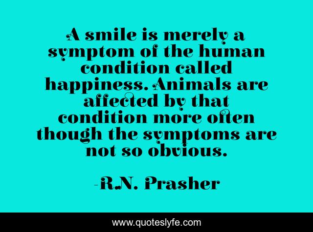 This page presents the quote "A smile is merely a symptom of the human condition called happiness. Animals are affected by that condition more often though the symptoms are not so obvious.". Author of this quote is R.N. Prasher. This quote is about witty, animals, humans, happiness, smile,.