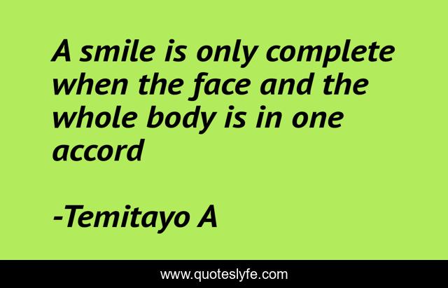 This page presents the quote "A smile is only complete when the face and the whole body is in one accord". Author of this quote is Temitayo A. This quote is about life, love, inspirational, be-happy, affection, laugh, smile, enthusiasm, happiness,.