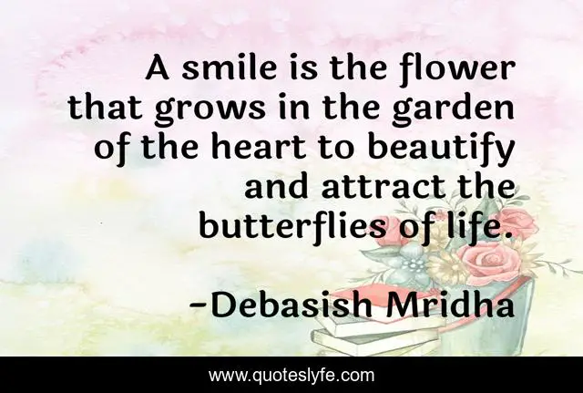 This page presents the quote "A smile is the flower that grows in the garden of the heart to beautify and attract the butterflies of life.". Author of this quote is Debasish Mridha. This quote is about garden-of-the-heart, miraboli, power-of-a-smile, butterflies-of-life, beauty, oscar-wilde, philosophy, debasish-mridha, tagore,.