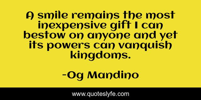 This page presents the quote "A smile remains the most inexpensive gift I can bestow on anyone and yet its powers can vanquish kingdoms.". Author of this quote is Og Mandino. This quote is about smile, kindness, happiness,.