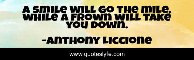 This page presents the quote "A smile will go the mile, while a frown will take you down.". Author of this quote is Anthony Liccione. This quote is about saddness, love, inspire, strengthen, attitude, mile, mirror, anger, hate,.
