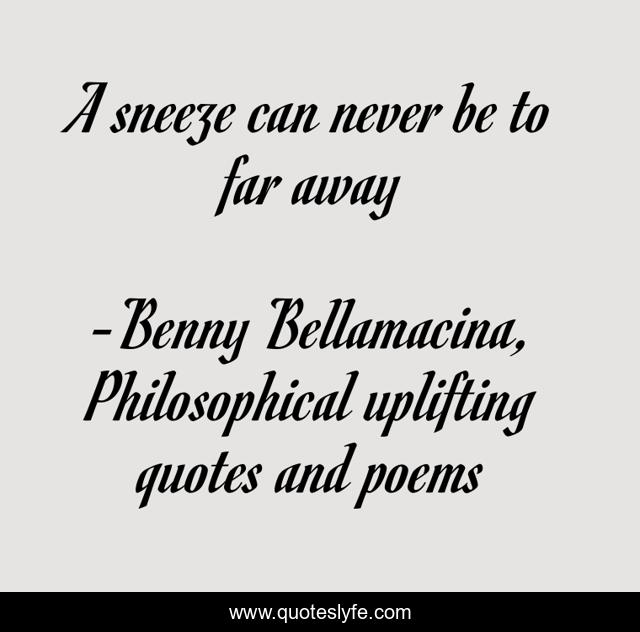 "Benny Bellamacina, Philosophical uplifting quotes and poems Quotes." Quoteslyfe.com, 2025. Sun. 07 Dec. 2025. <https://www.quoteslyfe.com/quote/A-sneeze-can-never-be-to-far-177060>.