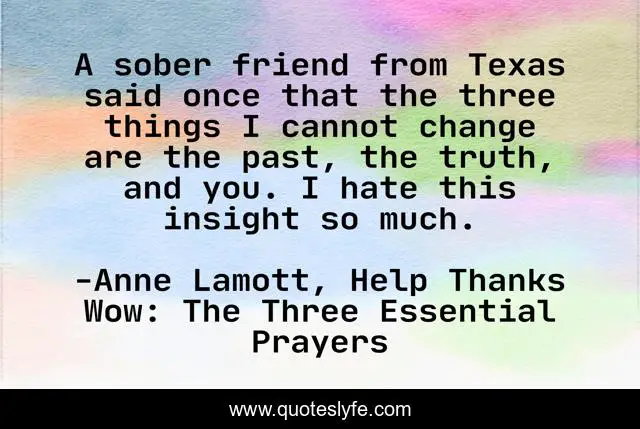 This page presents the quote "A sober friend from Texas said once that the three things I cannot change are the past, the truth, and you. I hate this insight so much.". Author of this quote is Anne Lamott, Help Thanks Wow: The Three Essential Prayers. This quote is about life-philosophy, insight, change,.