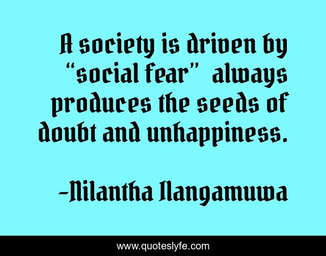 This page presents the quote "A society is driven by “social fear” always produces the seeds of doubt and unhappiness.". Author of this quote is Nilantha Ilangamuwa. This quote is about politics, life, systems, governance, society,.