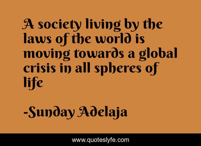 This page presents the quote "A society living by the laws of the world is moving towards a global crisis in all spheres of life". Author of this quote is Sunday Adelaja. This quote is about living, life, spheres, global, society, world, crisis, laws,.