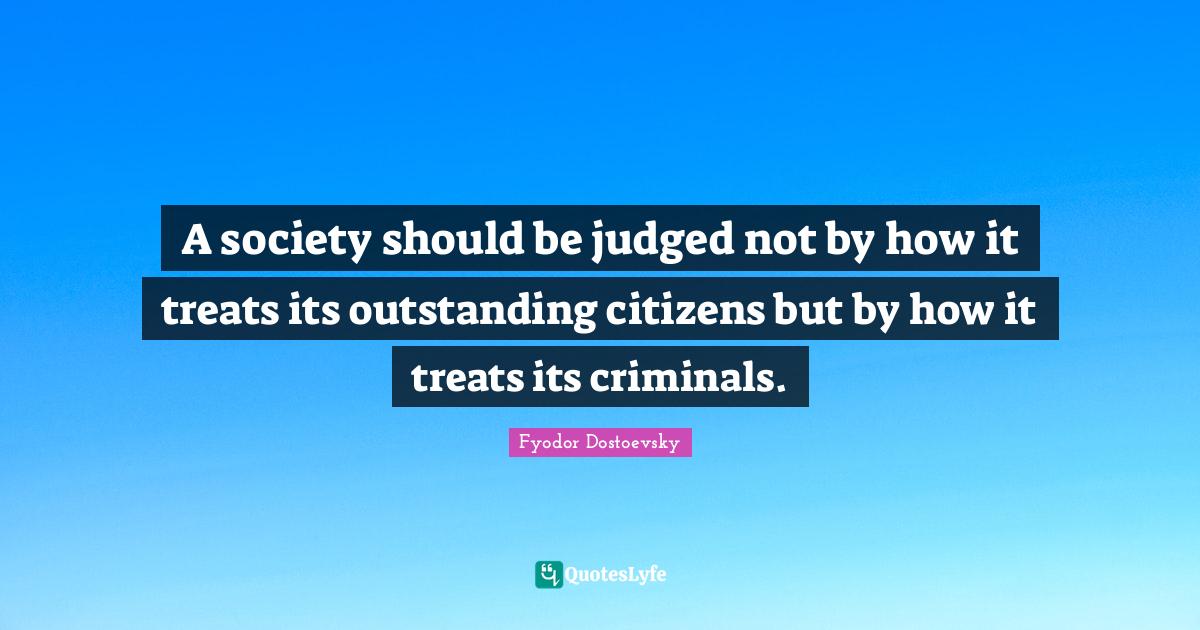This page presents the quote "A society should be judged not by how it treats its outstanding citizens but by how it treats its criminals.". Author of this quote is Fyodor Dostoevsky. This quote is about society, outstanding, criminals, prison, citizens, judged, treats,.