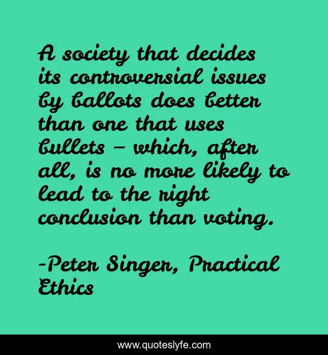 This page presents the quote "A society that decides its controversial issues by ballots does better than one that uses bullets – which, after all, is no more likely to lead to the right conclusion than voting.". Author of this quote is Peter Singer, Practical Ethics. This quote is about ethics, decision-making, violence,.