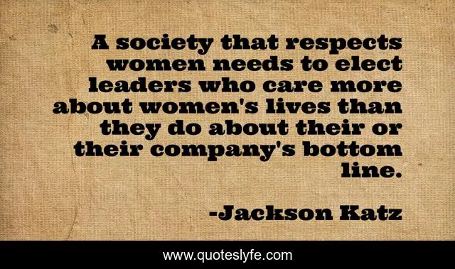 This page presents the quote "A society that respects women needs to elect leaders who care more about women's lives than they do about their or their company's bottom line.". Author of this quote is Jackson Katz. This quote is about company, women, care,.