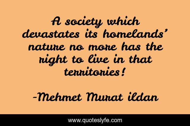 This page presents the quote "A society which devastates its homelands’ nature no more has the right to live in that territories!". Author of this quote is Mehmet Murat ildan. This quote is about devastate, homeland, nature, nature-destruction, devastated, no-more, murat-ildan, society, turkish-writers,.