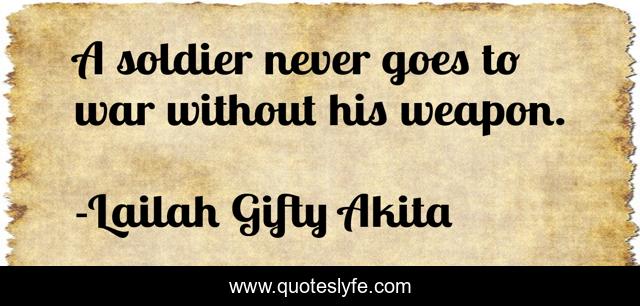 This page presents the quote "A soldier never goes to war without his weapon.". Author of this quote is Lailah Gifty Akita. This quote is about proverbs, weapon, soldier, war, wise-wisdom,.
