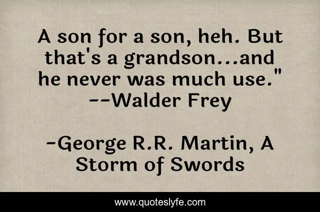 This page presents the quote "A son for a son, heh. But that's a grandson...and he never was much use." --Walder Frey". Author of this quote is George R.R. Martin, A Storm of Swords. This quote is about villain, murder, betrayal, evil,.