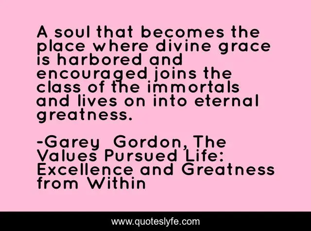 This page presents the quote "A soul that becomes the place where divine grace is harbored and encouraged joins the class of the immortals and lives on into eternal greatness.". Author of this quote is Garey Gordon, The Values Pursued Life: Excellence and Greatness from Within. This quote is about divine, grace, soul,.