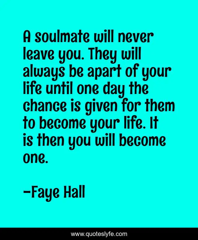 "Faye Hall Quotes." Quoteslyfe.com, 2025. Tue. 09 Dec. 2025. <https://www.quoteslyfe.com/quote/A-soulmate-will-never-leave-you-They-197711>.