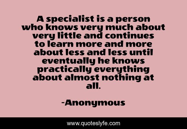 This page presents the quote "A specialist is a person who knows very much about very little and continues to learn more and more about less and less until eventually he knows practically everything about almost nothing at all.". Author of this quote is Anonymous. This quote is about professions, work,.