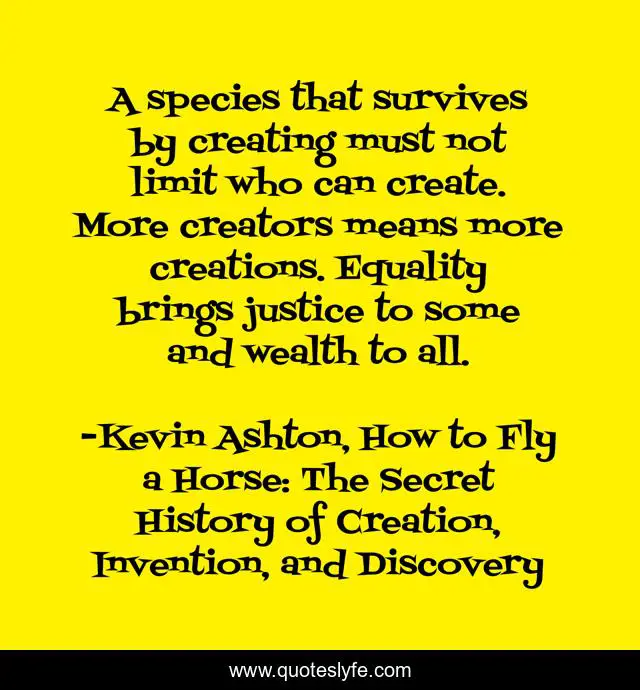 This page presents the quote "A species that survives by creating must not limit who can create. More creators means more creations. Equality brings justice to some and wealth to all.". Author of this quote is Kevin Ashton, How to Fly a Horse: The Secret History of Creation, Invention, and Discovery. This quote is about creation, equality,.
