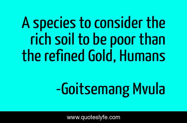 This page presents the quote "A species to consider the rich soil to be poor than the refined Gold, Humans". Author of this quote is Goitsemang Mvula. This quote is about soil, riches, gold, human,.