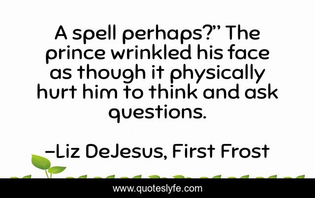 This page presents the quote "A spell perhaps?” The prince wrinkled his face as though it physically hurt him to think and ask questions.". Author of this quote is Liz DeJesus, First Frost. This quote is about fairytales, fantasy, young-adult,.