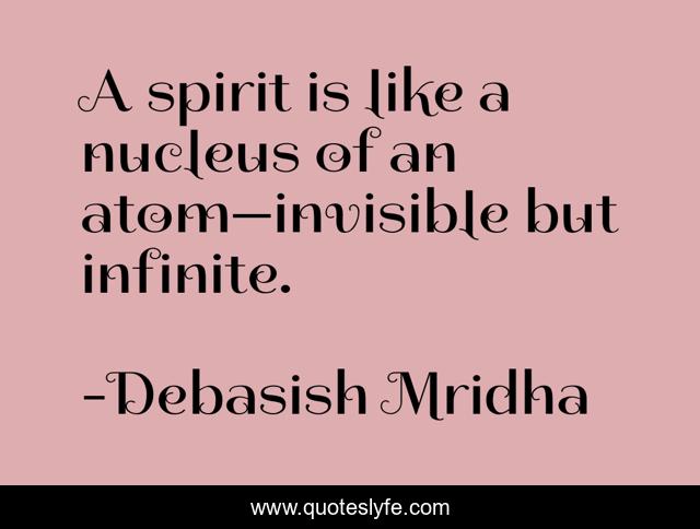 This page presents the quote "A spirit is like a nucleus of an atom—invisible but infinite.". Author of this quote is Debasish Mridha. This quote is about the-human-spirit, philosophy, debasish-mridha, quotes, debasish-mridha-md, inspirational, enthusiasm, spirit,.