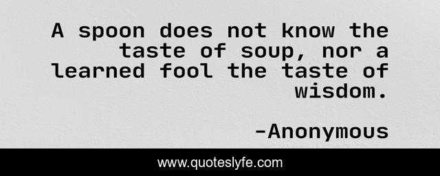This page presents the quote "A spoon does not know the taste of soup, nor a learned fool the taste of wisdom.". Author of this quote is Anonymous. This quote is about fool, welsh-proverb, wisdom,.