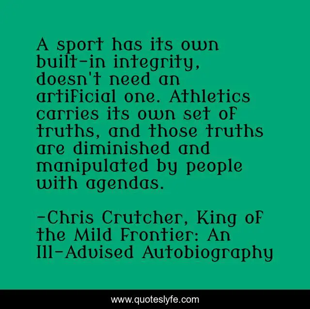 This page presents the quote "A sport has its own built-in integrity, doesn't need an artificial one. Athletics carries its own set of truths, and those truths are diminished and manipulated by people with agendas.". Author of this quote is Chris Crutcher, King of the Mild Frontier: An Ill-Advised Autobiography. This quote is about athletics, integrity, truth, sports,.
