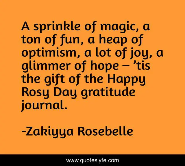 This page presents the quote "A sprinkle of magic, a ton of fun, a heap of optimism, a lot of joy, a glimmer of hope – ’tis the gift of the Happy Rosy Day gratitude journal.". Author of this quote is Zakiyya Rosebelle. .